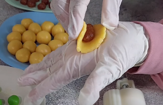 - Selanjutnya untuk bahan olesan , siapkan kuning telur, kental manis dan minyak goreng aduk rata, lalu oleskan di atas kue nastar.